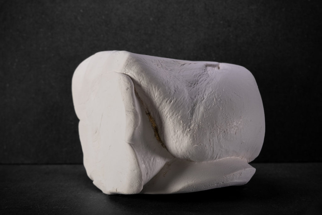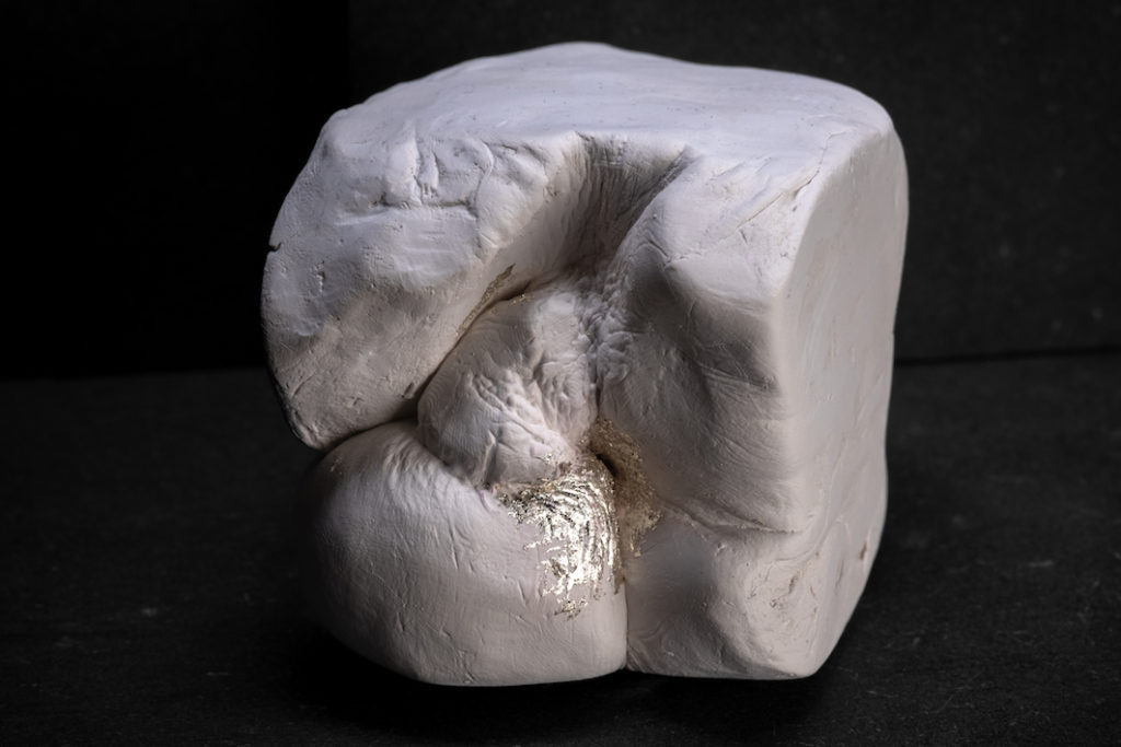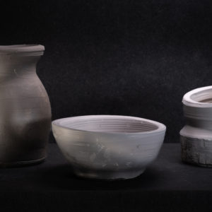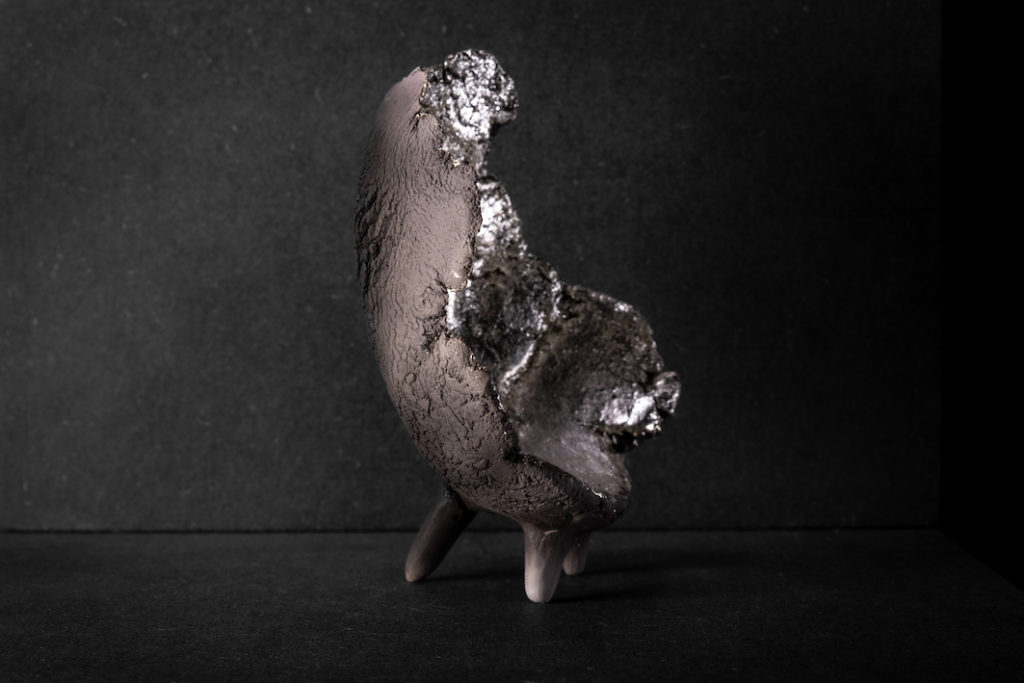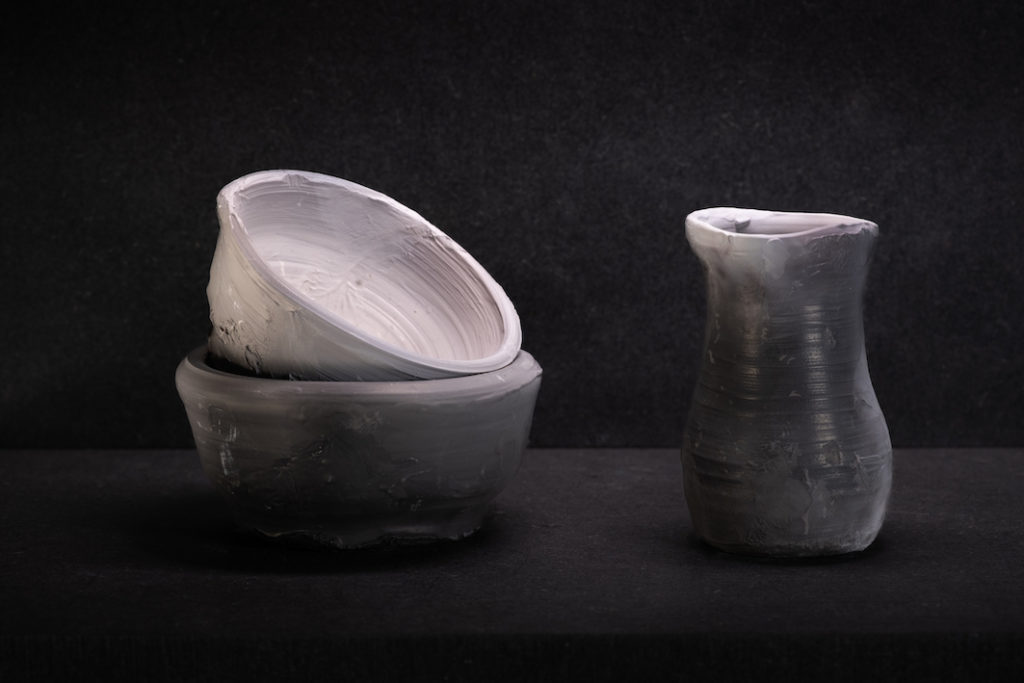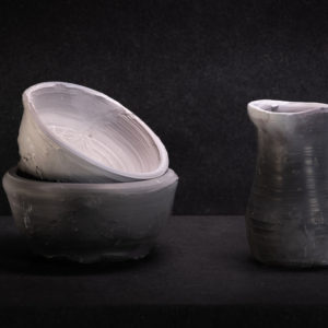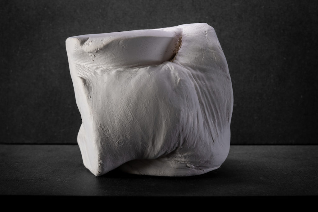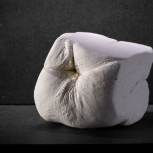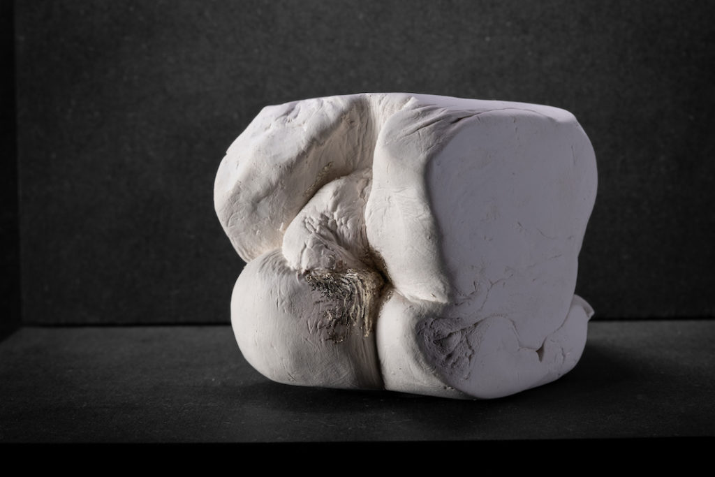 Suite à une formation de céramiste au CEPV à Vevey, Zoé Genet-Berthoud navigue entre céramique, sculpture, peinture, couture et confitures. Quelques années après la naissance de ses enfants, elle prend conscience violemment, maladivement, à quel point les deux états — celui d’artiste et celui de parent — se confrontent et s’entrechoquent. Faute d’atelier, de temps et d’espace, c’est la cuisine qui devient le lieu de création. Le micro-ondes sert de four à céramique, la table à manger pour le tournage, le salon pour le modelage et le jardin pour l’enfumage. Un minuscule tour permet de façonner de petits contenants fragiles et bruts, tandis qu’un geste de ras-le-bol transforme des masses de porcelaine thixotrope en morceaux de chair.